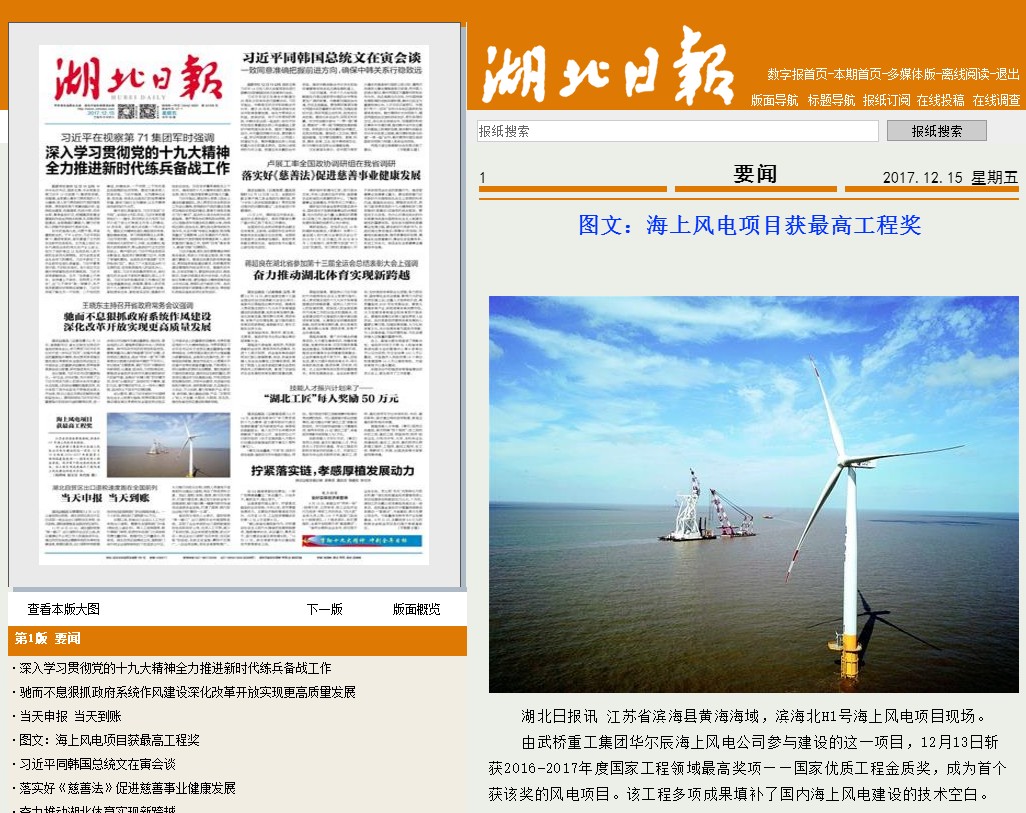 12月13日,2016-2017年度國(guó)家工程領(lǐng)域最高獎(jiǎng)項(xiàng)——國(guó)家優(yōu)質(zhì)工程獎(jiǎng)在北京人民大會(huì)堂舉行頒獎(jiǎng)儀式。國(guó)家電投集團(tuán)濱海北H1#100MW海上風(fēng)電項(xiàng)目被授予該獎(jiǎng)項(xiàng)最高榮譽(yù)——金質(zhì)獎(jiǎng),成為國(guó)內(nèi)風(fēng)電工程(陸上、海上)首個(gè)獲得國(guó)家優(yōu)質(zhì)工程金質(zhì)獎(jiǎng)項(xiàng)目,受到眾多媒體的熱捧。華爾辰海上風(fēng)電公司該項(xiàng)目的參建方,負(fù)責(zé)風(fēng)機(jī)基礎(chǔ)沉樁施工和附屬構(gòu)件安裝,同樣受到多方媒體的宣傳采訪。